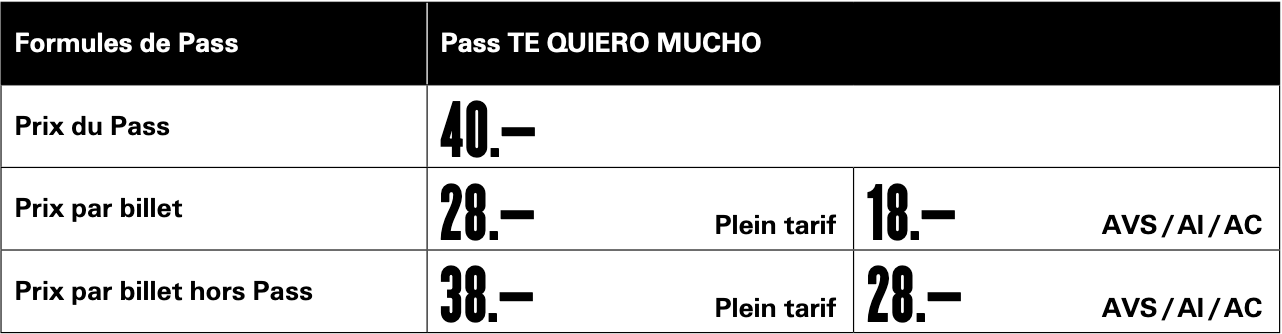 Un Pass unique repensé pour vous permettre de découvrir la programmation* en toute flexibilité ! Le Pass TE QUIERO MUCHO donne droit à des tarifs attractifs pour la catégorie Plein tarif et AVS / AI / AC.