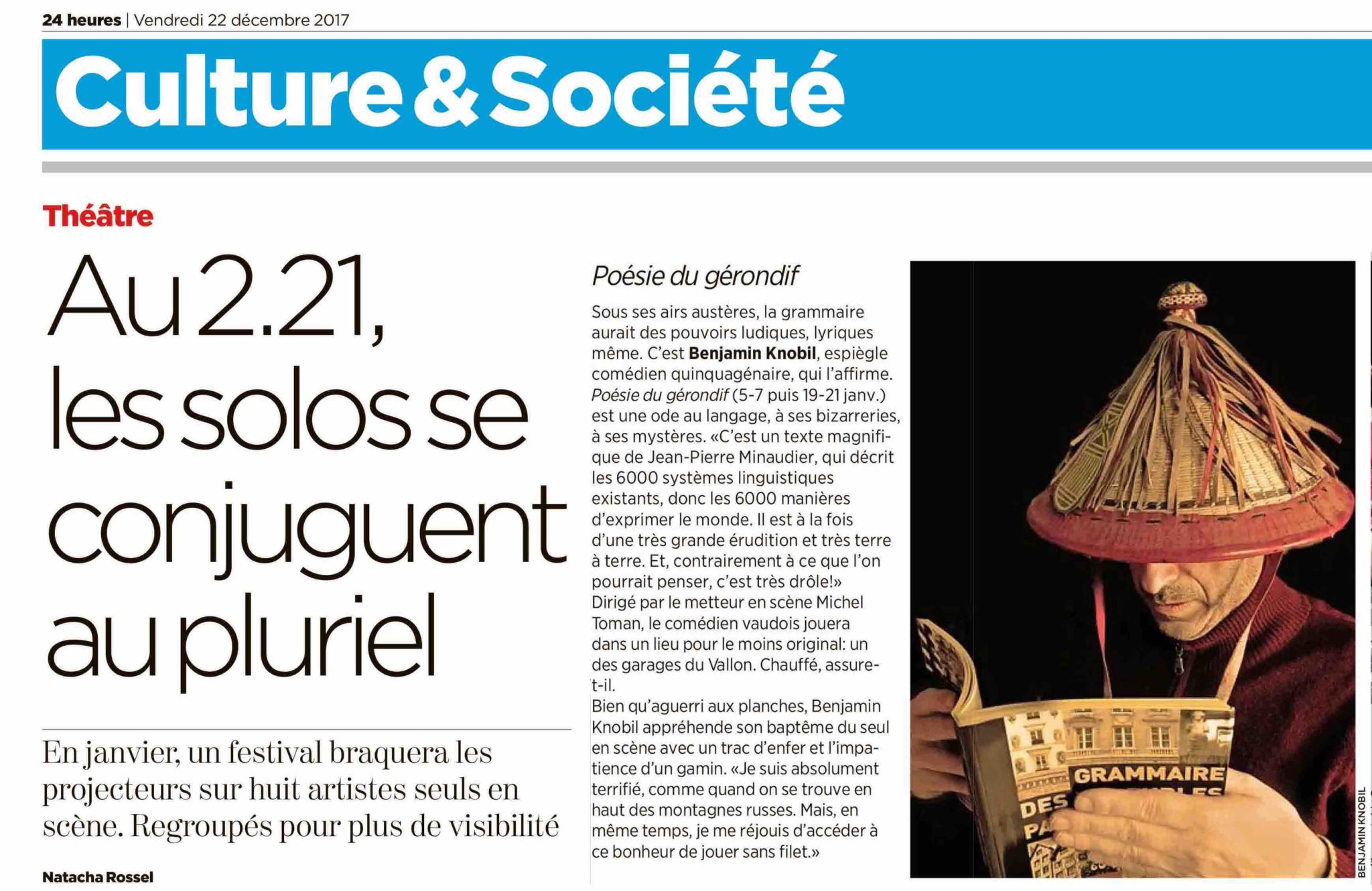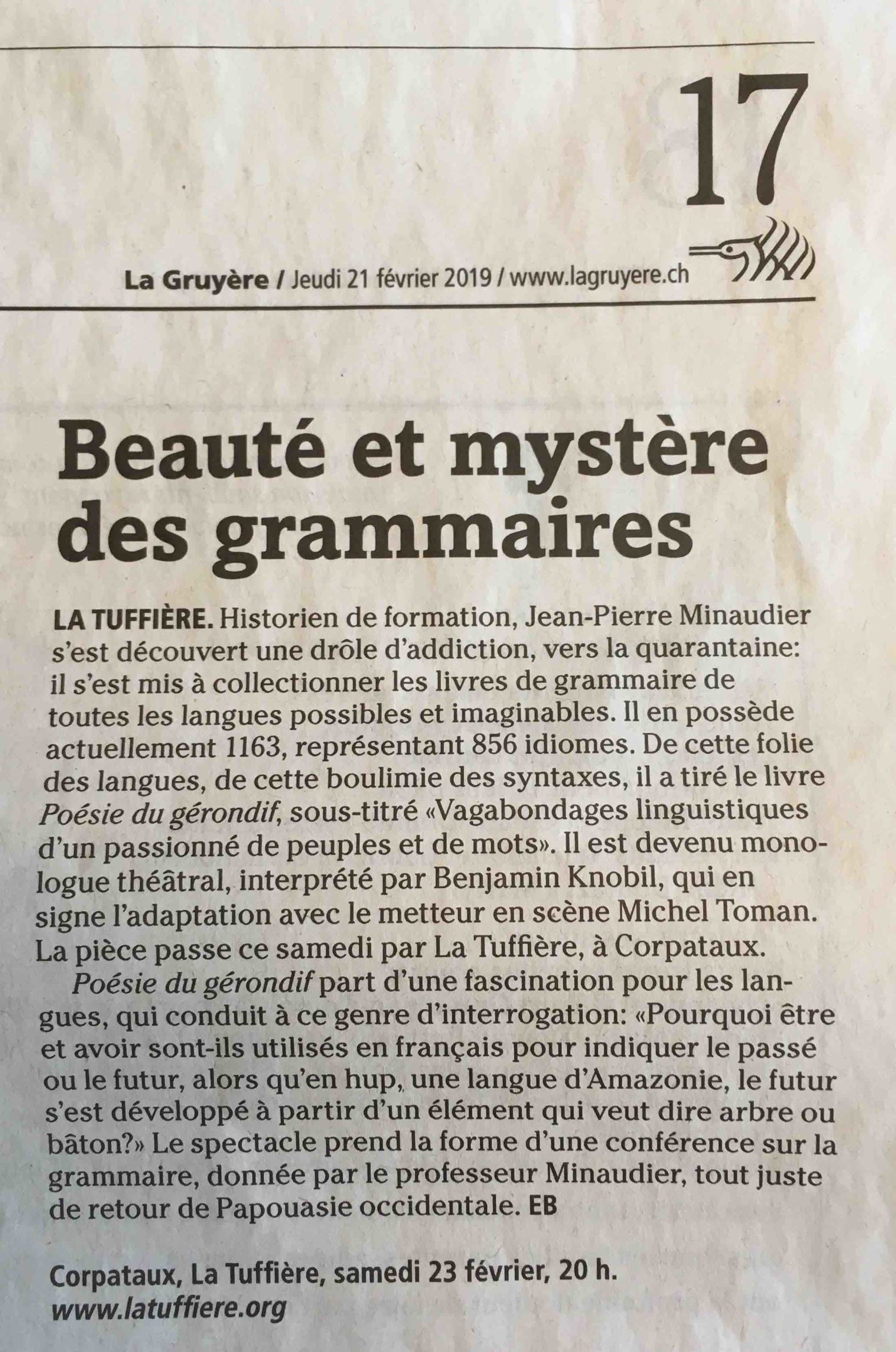 La Poésie du gérondif est une ode hilarante au langage, à ses bizarreries, à ses mystères. Ce texte magnifique de Jean-Pierre Minaudier décrit les 6000 systèmes linguistiques existants, donc les 6000 manières d’exprimer le monde. L’auteur est un passionné de grammaire. Collectionneur fou, il possède 1163 précis de grammaire recouvrant 856 langues. Il les dévore comme des romans policiers !